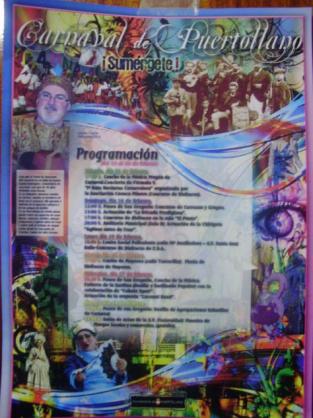 Ya estoy aqui de vuelta; como mañana empieza el carnaval no queria dejar de acercaros un poquito más esta fiesta, y aqui os traigo el cartel anunciador de dicho evento, que no sé si podreis vislumbrar bien, aparte de fotografias de carnavales de otros tiempos y actuales, podeis ver a Santos Espejo, que este año es el mascarón 2010; en el recuadro de la Izquierda justo debajo de la foto de Santos pone lo siguiente: