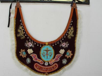 Naturalmente M. Carmen es un especie de babero emulando lo que se llama "peto pa atras". En el pueblo de Peñalsordo hay una tradición muy antigua donde en la octava del Corpus se vestian (y se visten) magnificos caballos con esta indumentaria. Ahora es en Guadalupe donde se pasean nobles equinos con estos bellos adornos, tal evento es el día de la Hispanidad, día 12 (que nosotros llamabamos día de la raza).