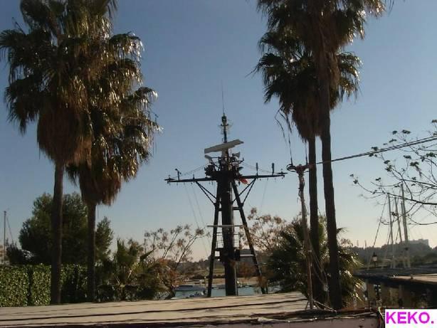 Entre las palmeras la torre de la embarcación,