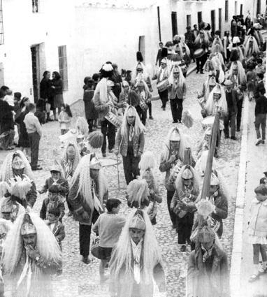 La fotografia realizada según creo en la decada de los 50, podemos ver la turba de la cola blanca, por la calle Alta, en el desfile de las estaciones, el Jueves Santo por la tarde. Podemos ver la anigua pavimentación que tenia esta calle, por aquellos años, que era el antiguo empredado.