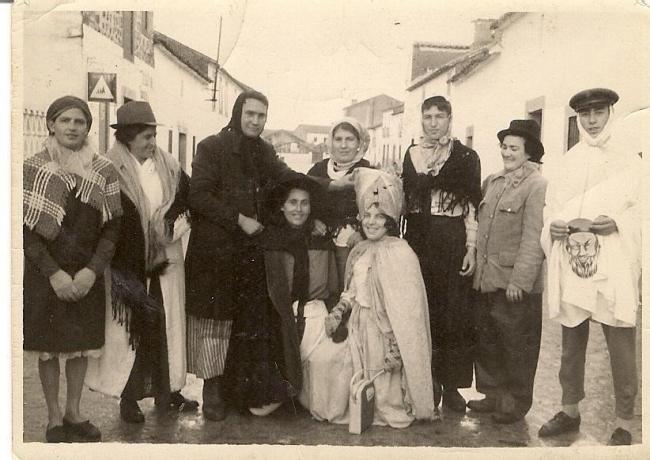 Esta foto como se puede comprobar es de carnaval. Aunque van disfrazados, creo que se reconocen, pero por si acaso: Empezando por laizquierda de pie está Gafitas, le sigue mi madre, Gabriel, Isabel (Garija), su primo (hijo de la campanera), Anita (la Pepina), y Adrian. Agachadas Josefa y Maruja hermana de Adrian.