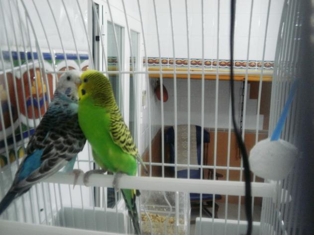 Pepito y Pepita metios en la jaula. Buena noches Vicen por aquí lloviendo aunque no mucho