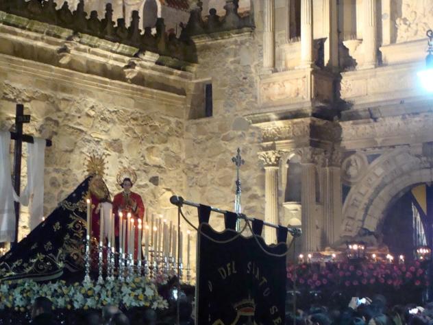 Son los titulares de la Hermandad del Sepulcro ante la Catedral de la Sierra en la noche del Viernes Santo hinojoseña