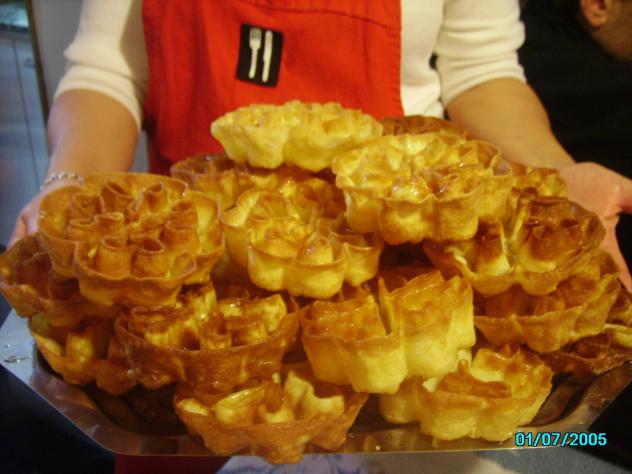 Fruta sarten, asi se llaman estas requisimas flores, hechas con leche huevo y arina, se utiliza un molde, de hierro, que les da la forma, son fritas en abundante aceite bien caliente, depues de fritas, son bañadas en miel.