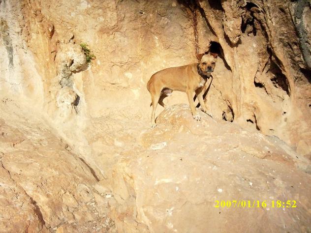 En la pared que hay justo encima del lomo del perro, Patrás, están las pinturas rupestres, desgraciadamente muy deterioradas por el paso de los años y por la mano víl de algún desaprensivo que con seguridad no se quiere ni a él mismo. He puesto el perro aquí, para celebrar que ha vuelto pués el dia 21 de Agosto cuando tiraron el primer cohete de las fiestas se perdió y ha vuelto a los 15 dias, y eso que no llevaba, ni bolsa de fin de semana ni cantimplora.