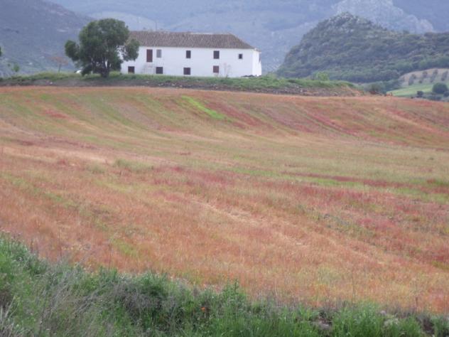 A mi por lo menos sí que me gusta, tiene una vista preciosa, más o menos una semana antes de tomar la foto este campo ha sido tratado con herbicida para matar la hierba y al empezar a secarse ha tomado ese bonito color roseado.