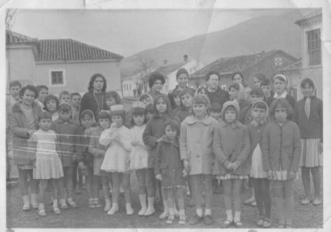 Niños en la plaza del pueblo (foto antigua),