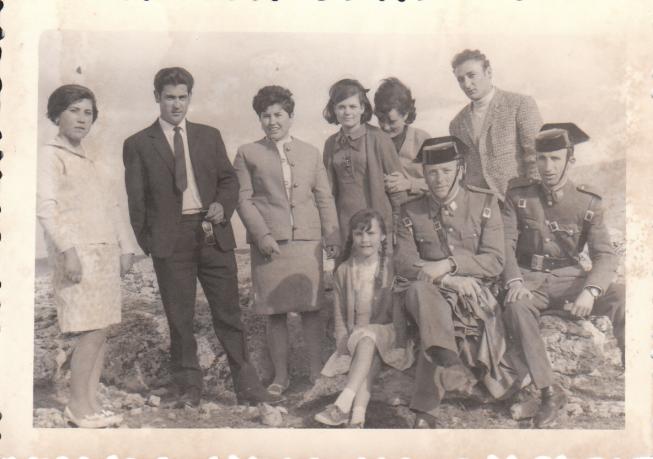 empezamos por la izquierda: Maria de la Rosario de Lucena, Carmona (novio de la Carmela), Carmela Hermana de la Maria e hija de la Rosario de Lucena, la Encarnita de Barranzos, La Paquita de Aranda con su novio Pepe el rubio del herraor (mis padres) la niña que esta al lado de los civiles es mi tia encarnita (hija de la encarna de Aranda), el civil que hay al lado de mi tia es Juan, el otro no se quien es.