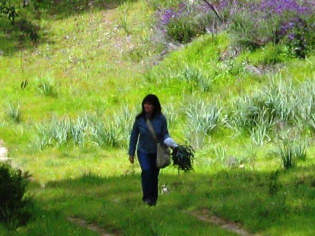 Con un ramo de eucalipto,
