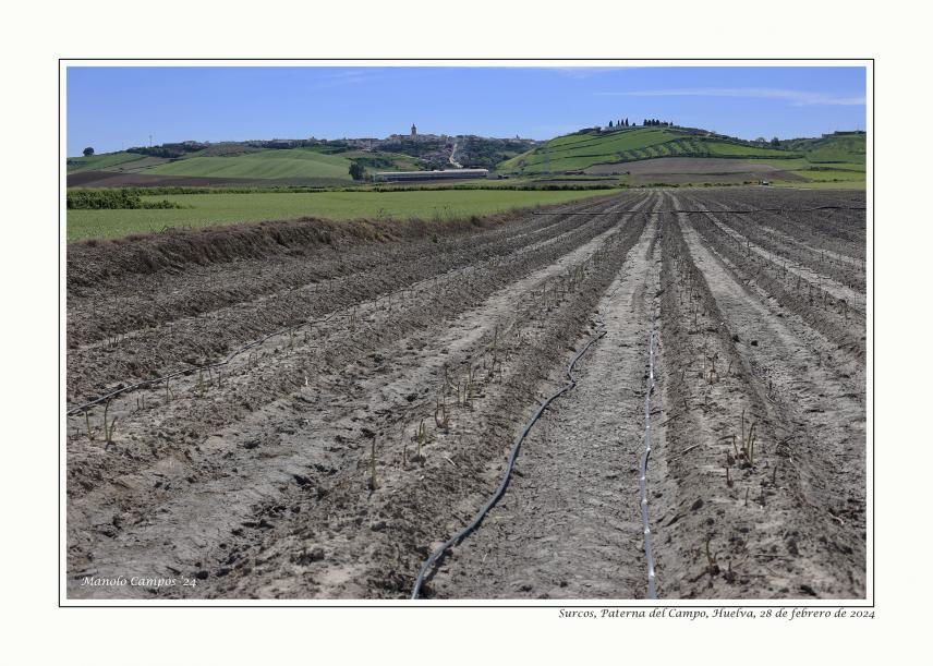 Surcos con el pueblo al fondo,