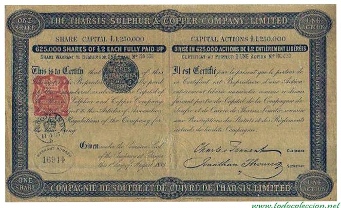carros hasta la ría de Huelva. La sociedad francesa así formada "Compagnie des Mines de Cuivre de Huelva" siguió trabajando hasta 1.866, pero problemas financieros la obligaron a paralizar los trabajos y buscar nuevos capitales, acabando por arrendar las minas el 1 de Noviembre del mismo año a una poderosa compañía británica que tomó el nombre de "The Tharsis Sulphur & Copper Company Limited", con sede en Glasgow, refundiéndose posteriormente ambas entidades en una sola. Esta sociedad británica fue la que construyó el ferrocarril de Tharsis al