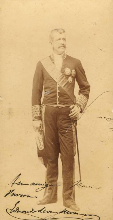 El nombre correcto es Eduardo León Llerena (según mi información). No era militar ni del Castillo. Se trata de Eduardo León Hervás, abogado. Fue senador. Murió a principios del siglo XX en Marmolejo, de donde era natural. La foto está dedicada a Federico Parera. ¿Quien era este militar, si no se le podia toser? Cualquiera le tosía a éste militar.-