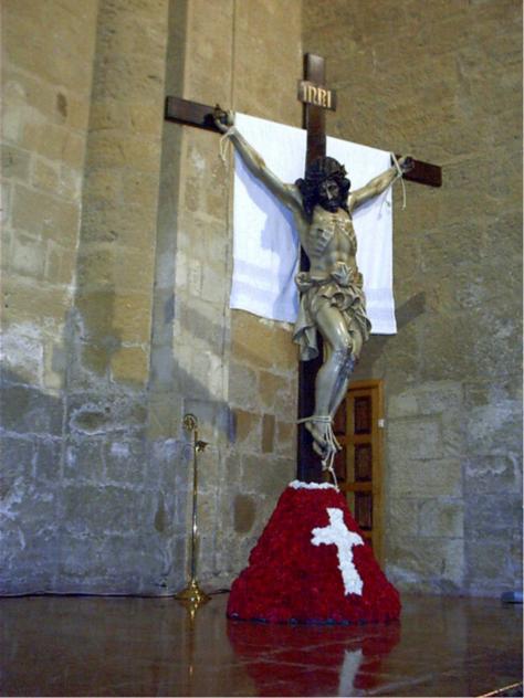 Este año el triduo son los días 16 y 18 de Marzo a las 7 de la tarde y el día 17 a las 8 de la tarde. Esta foto corresponde a la Semana Santa del año 2007 tras la ofrenda floral que como cada Lunes Santo se ofrece en honor a la imagen del Santísimo Cristo del Perdón. La posición erguida de la imagen se mantiene desde el momento de su descenso, para el triduo que se celebra en su honor, hasta la mañana del Jueves Santo en que es colocada en las parigüelas en posición de semitumbado hasta el Vía Crucis que a partir de las 12:00 de la noche recorrerá las calles de nuestra localidad y que recomiendo... QUE FOTO MÁS BONITA. ¿Esta foto que es del año pasado? Porque es la primera vez que veo la imagen de esa manera (de pie), siempre a estado tumbada.... preciosa foto muy buena desde una gran perspectiva Las flores situadas en la base de la imagen son aportadas por los hermanos cofrades y vecinos del pueblo durante la ofrenda floral que se realiza cada Lunes Santo por la tarde.