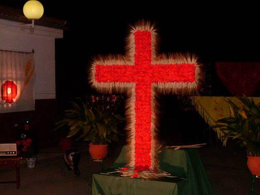 Hola, pues para que estés tranquilo, estas cruces no tinen el signifido que tu crees que tienen. No sé si te sonará la fiesta de "las cruces de Mayo", pues ese es el motivo de la elaboración de estas maravillosas cruces. Es una fiesta cristiana, que se realiza todos los Mayos de cada año, especialmente en la región de Andalucía, siendo más acentuada en Granada, Córdoba y Sevilla. En nuestro pueblo esta fiesta no se hacía hasta hace tan solo tres años.