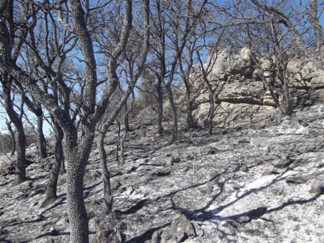 Desde la distancia el color grisáceo y el olor a quemado se minimizan, empequeñeciendo a su vez la herida abierta, que además parece cicatrizar a buen paso, pero cuando hundes tus zapatos, botas en este caso, en el suelo de ceniza, hueles los maderos a un palmo de la nariz y...