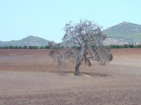 Estos chaparros, majestuosos, hacen sombra a la olivas plantadas hace poco, y peligran.