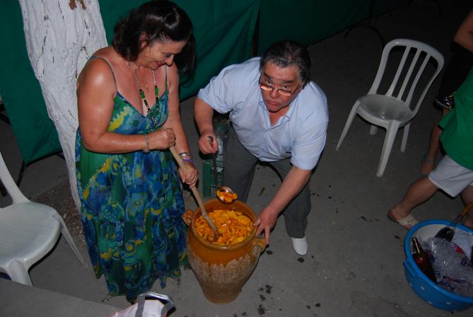 ¡Qué rico se ve...!, yo creo que con ese color que tienen esos melocotones y con ese gusto que lo están revolviendo, en cualquier envase donde se hubiera hecho, hubiese quedado delicioso; según dicen, lo más importante es estar de buen ánimo cuando se prepara algo así, y yo creo que "buen ánimo", ustedes lo tenían de sobra.