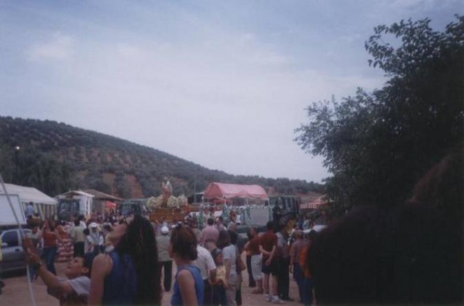 Tras subir la cuesta, llega a la explanada. La carroza se para y todas las demás la rodean. Santa Quiteria es bajada y a hombros de sus romeros paseada por el recinto, entre los chozos y casetas.