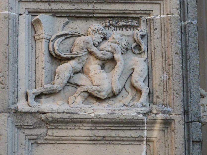 En estos relieves, junto a motivos del Antiguo y Nuevo Testamento, aparecen otros, pganos, como esta representación de la mítica lucha de lapitas y centauros tras el enlace entre Hipodamia y Piritoo.
