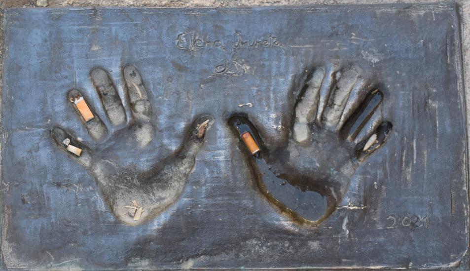Manos de Elena Irureta (con algunas colillas) en el "Paseo de la Fama" de Úbeda, calle Mayor,
