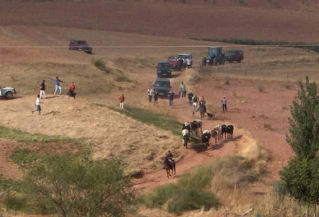 En esta foto vemos como se dirige la ganaderia a las calles del pueblo, en uno de los encierros celebrados en las fiestas de Septiembre del 2004. Al lado del suzuki rojo salimos mi primo "Carlitos" y yo, más conocido como el "Figura". La verdad es que no se si fue el encierro donde las vacas se dieron la vuelta y nos dieron un buen susto. En cualquier caso felicito a quien haya subido la foto. Saludos a todos los del pueblo. Esos tres que van al lado del todoterreno rojo pasaron más miedo que nunca, sobre todo el que está en el centro. Poner todas las fotos que tengais de lso encierros por favor, gracias. Bonita foto del encierro, en esa linea se deben sacar, claridad absoluta, ánimo para que siga sacando más el protagonista de esta foto.