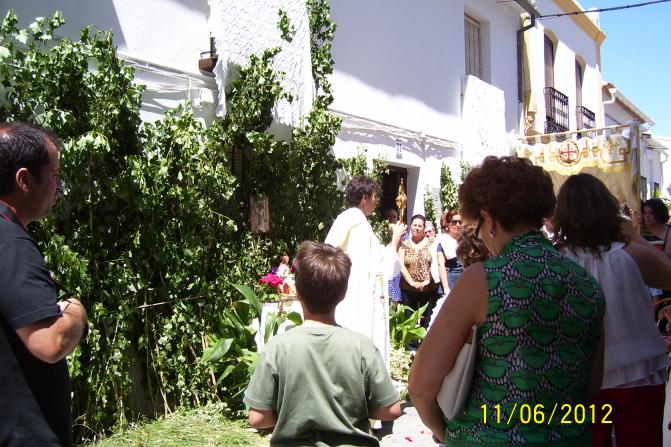 altares instalados por los vecinos en sus portales, que reciben al Santísimo en la Custodia bajo Palio, es depositada en cada uno de los altares, breves rezos, el Párroco imparte la bendición, y sigue la procesión entonando cánticos religiosos,