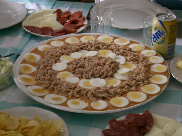 Carratraca, en otros sitios "Salmorejo". En resumen, es un Gazpacho andaluz muy espeso, adornado con atún y huevos duros. Delicioso en