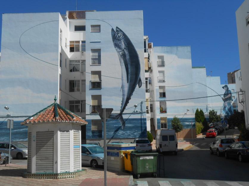 España. Está elaborado con pintura acrílica de exteriores y esmaltes, utilizando la técnica del trampantojo para jugar con las distintas perspectivas y recrear una secuencia en la que el pescador lanza una caña y atrapa una pieza.