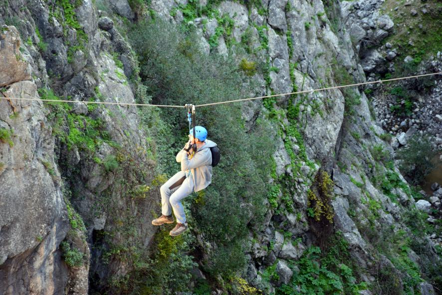 Montañero en apuros en la tirolina,