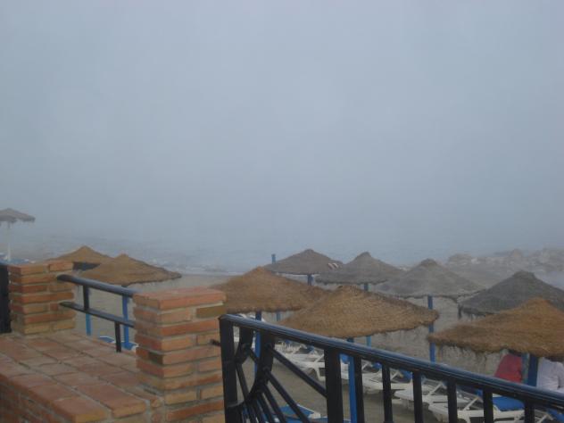 en la playa con niebla,