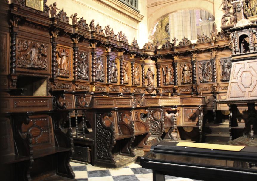 calles y ático. Se comenzó su construcción en la primera mitad del siglo xvi, y sus autores fueron Nufro Ortega y Juan Bautista Vázquez el Viejo. La policromía fue realizada entre 1564 y 1670. En los laterales del banco hay relieves de los Padres de la