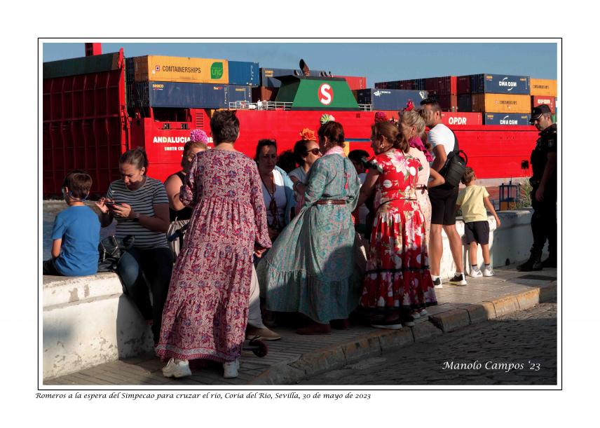 Romeros de la Hermandad de Las Cabezas esperando la carreta del Simpecao para cruzar el río,