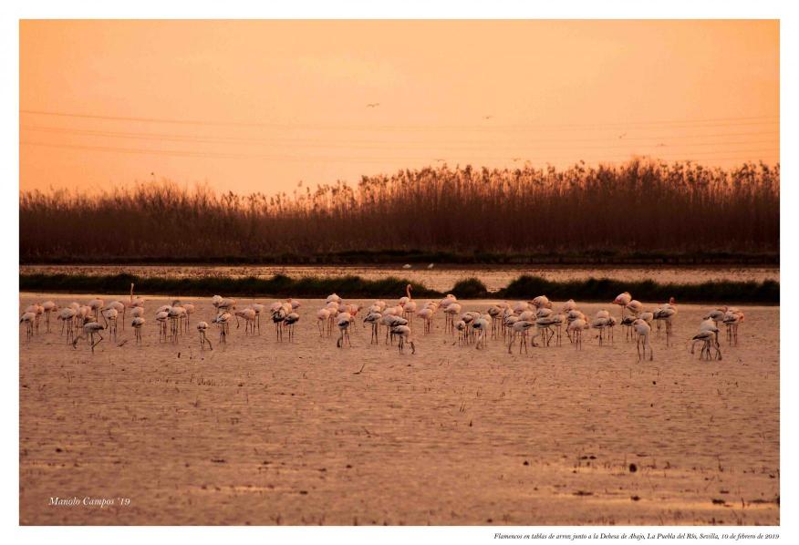 Flamencos en tabla de arroz junto a la Dehesa de Abajo,