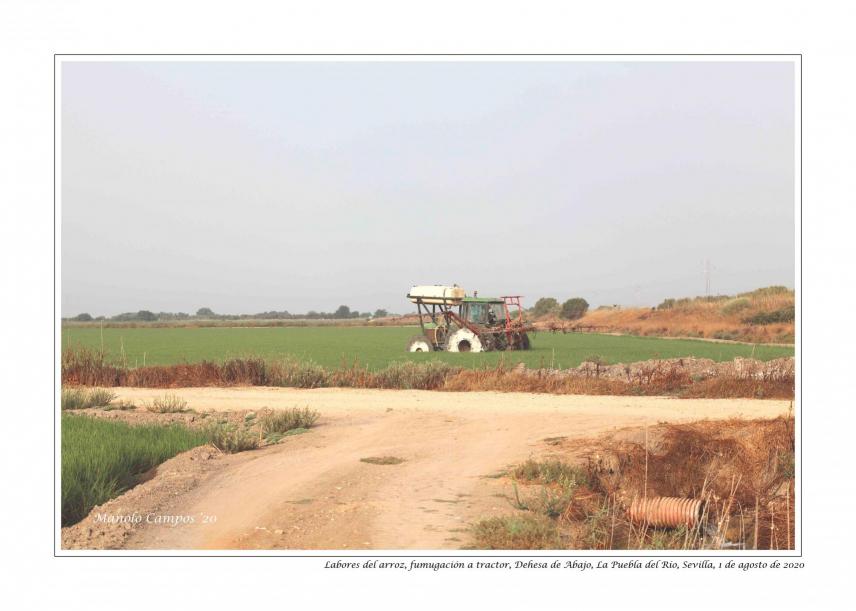 Labores del arroz, fumigación con tractor,