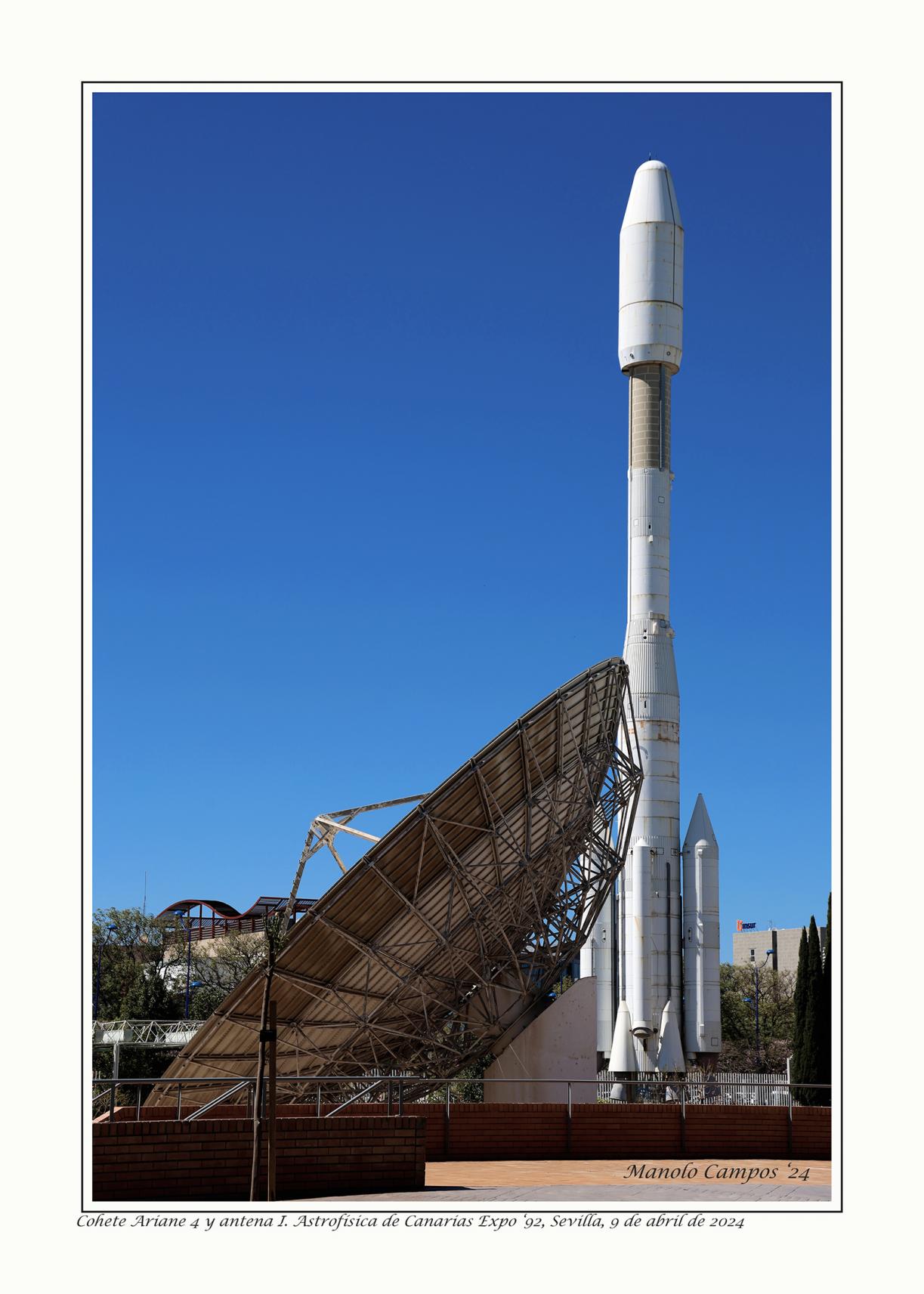 Cohete Ariane 4 y antena del Instituto de Astrofísica de Canarias, Expo '92, SEVILLA (9 de Abril de 2024)