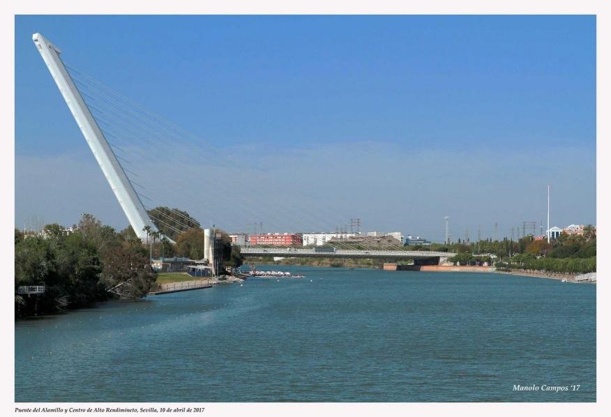 Puente del Alamillo, de Santiago Calatrava, se inauguró en 1992, con motivo de la Expo '92. Este puente no tiene tirantes de retenida, ejerciendo de contrapeso a doscientos metros de puente y gracias a trece largos cables, un solo pilar. Une