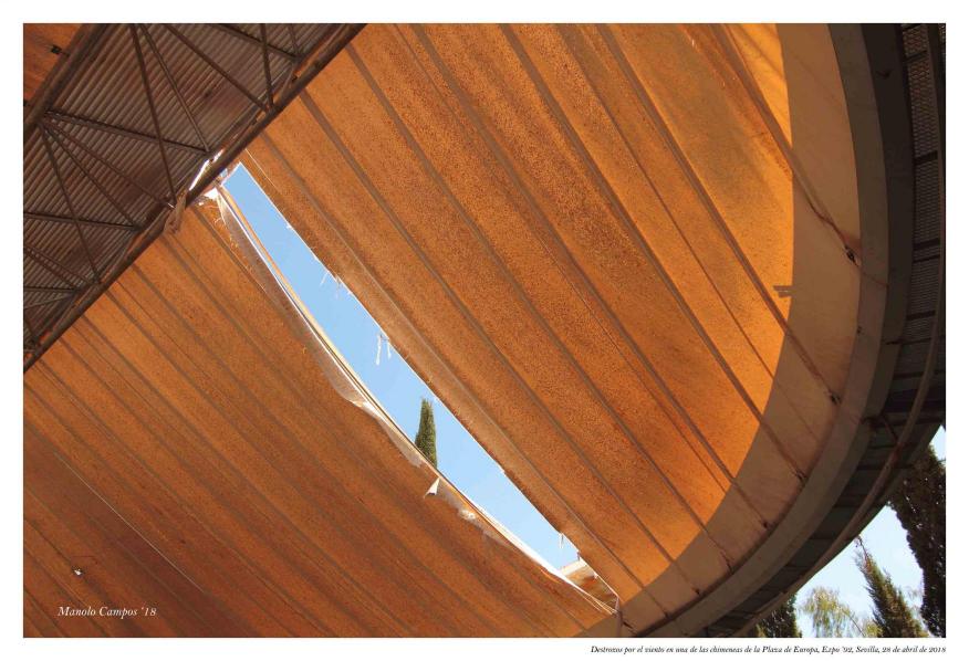 Destrozos por el viento en una de las chimeneas de la Pza. de Europa, Expo '92,