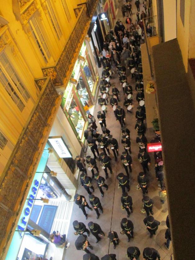 Desfile de una banda musical en la calle Sagasta,