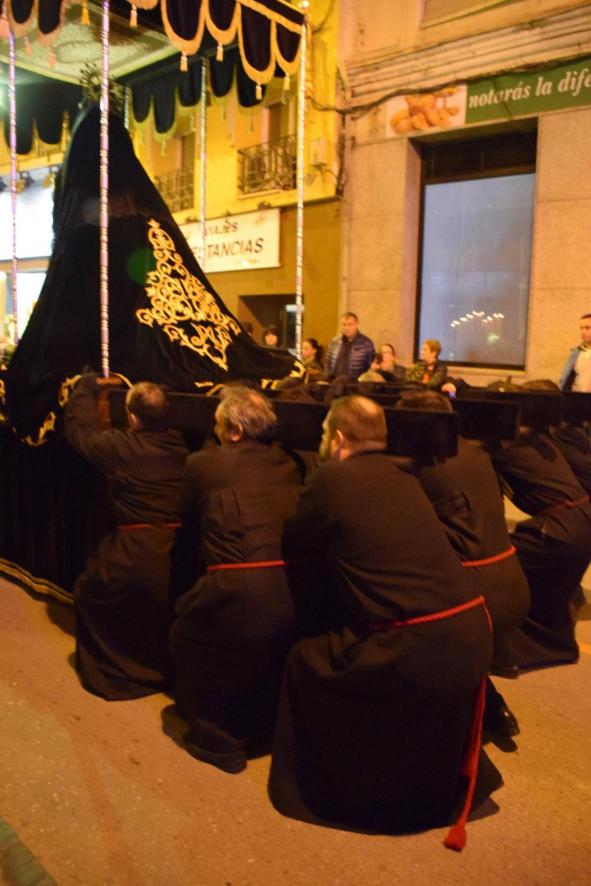 Costaleros en pleno esfuerzo levantando el paso de Nuestra Señora de la Soledad,