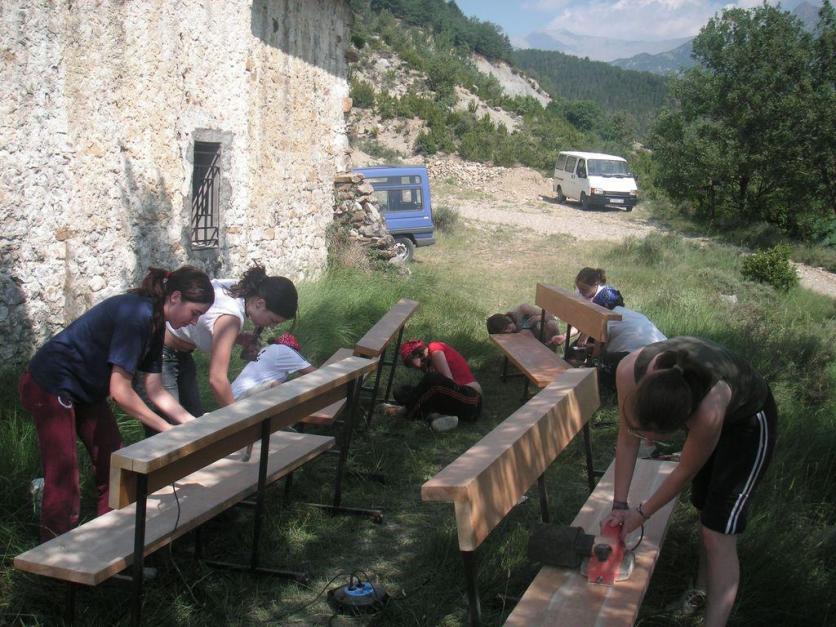 Pintando los bancos de la ermita de San Blascut,