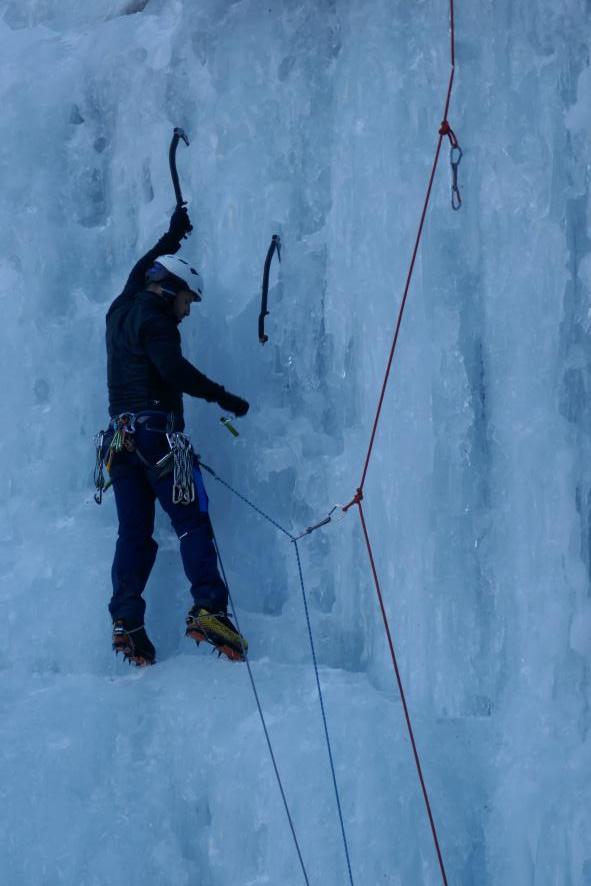Ardonés. emplazando tornillo de hielo como seguro,