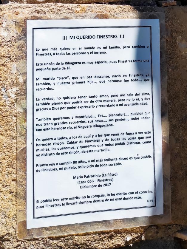 Si podéis leer este escrito no lo rompáis, lo he escrito con el corazón, pues Finestres lo llevaré siempre dentro de mi esté donde esté.”
