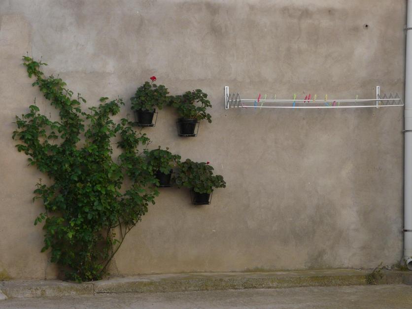 Las macetas comparten la pared con el tendedero,