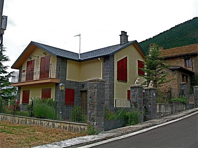 Bonita casa con ventanas rojas,