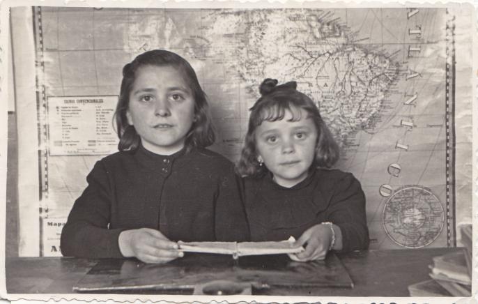 Hermanas en la escuela. Carmen y Pilar (foto antigua),