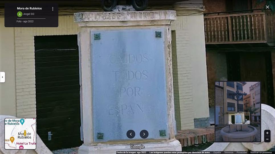 Paseando a pie de calle (con el muñequito de Maps) por Mora de Rubielos (Teruel), encontré en el 5 de la Av. Ibañez Martín, esta preciosa cruz de hierro forjado. Comprobé que con la excusa de la Memoria Histórica, iban descaradamente a por ella, a eliminarla por franquista. Pero vi también que ella solita (léase lo que dice la placa) tenía recursos para defenderse. Más información en el blog Desolvidar: https://patximendiburu. blogspot. com/2023/03/cruz-caidos-todos- por-espana-mora-de. html