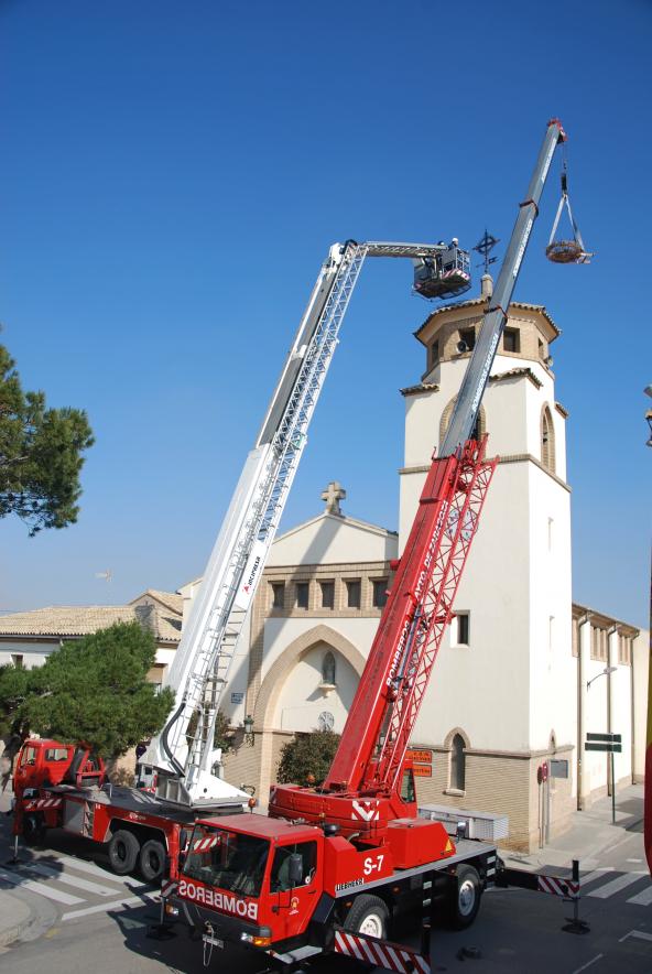 Colocación del nuevo nido de cigüeñas en la torre,
