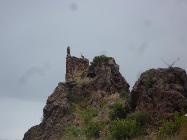 Restos del torreón del castillo y "turista alado",