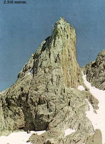 "Pasada esta emocionante paredilla llegamos a la cima, que es un espacio de tres metros de largo por dos de ancho, compuesta por un caos de rocas fragmentadas por las fuerzas telúricas de los impactos de las chispas, ya que esta cima es indiscutiblemente un buen pararrayos, puesto que en estas rocas hemos contemplado vetas metálicas. La vertical hasta la horcadina es del orden de 110 metros que si en verdad es la vía mas corta, probablemente no será la más fácil".