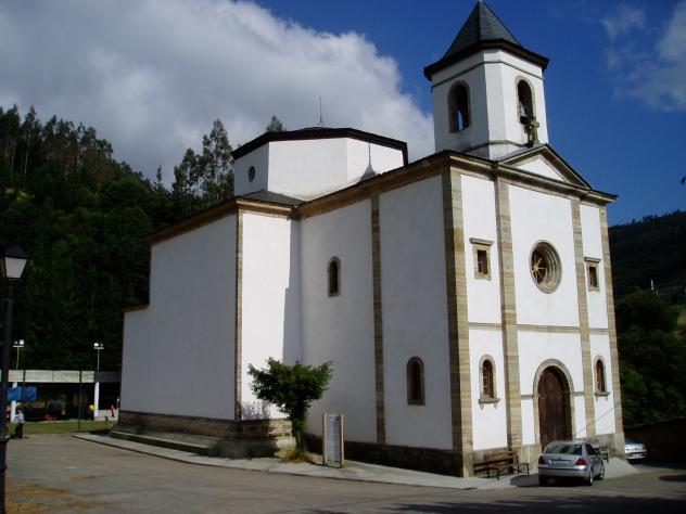 Este templo se edificó ajustando las medidas exactas para albergar dentro de él los retablos barrocos procedentes del desaparecido monasterio cisterciense de Santa María de Lapedo, del concejo de Belmonte de Miranda. Las piezas de este retablo fueron transportadas hasta aquí en carros tirados por bueyes. Las obras de construcción del edificio culminaron en 1898.